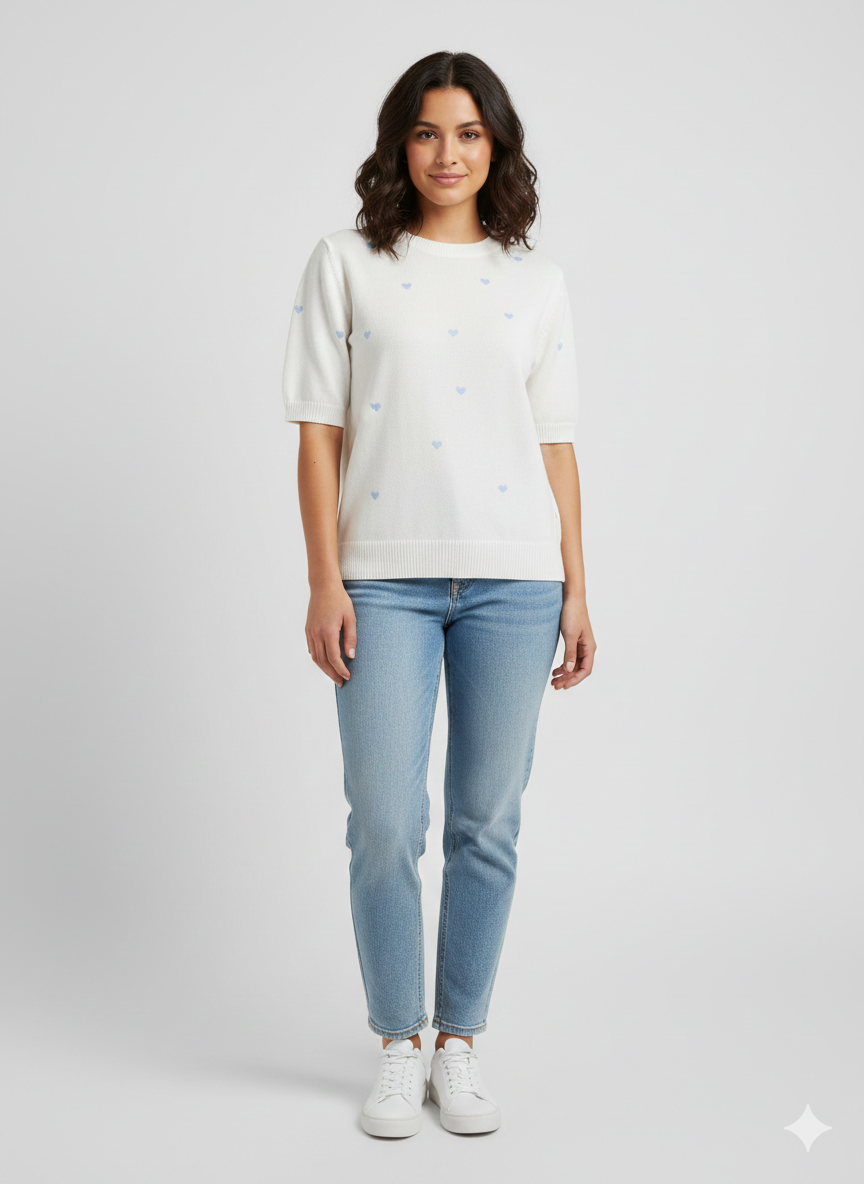 Damen Feinstrick-Pullover weiß mit hellblauen Herzen